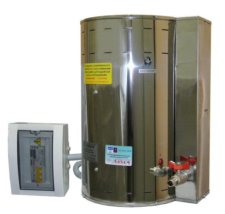- Двойная оболочка и теплозащитный кожух обеспечивают умеренно теплую (не более 45°С) поверхность аквадистиллятора при его работе и предохраняют эксплуатирующий персонал от тепловых ожогов.
