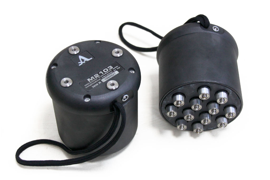 Низкочастотная антенная решетка с сухим точечным контактом М2103 – на 100кГц для излучения и приема продольных ультразвуковых волн. Две антенные решетки M2103 используются совместно с прибором А1220 MONOLITH и применяются для сквозного прозвучивания объектов из бетона и железобетона в диапазоне толщин от 200 до 2500 мм.