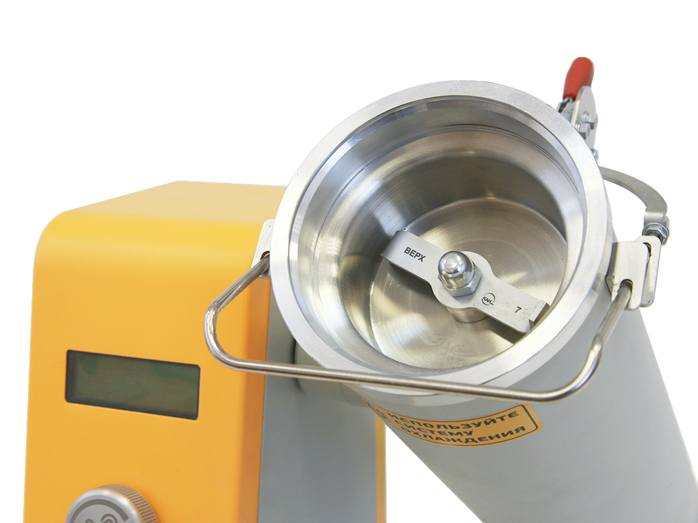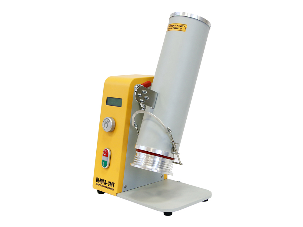 Для загрузки и выгрузки проб используется чашка, которая крепится к размольному узлу фиксатором. Размольный узел мельницы имеет возможность поворота на 225 ̊ и фиксации в двух положениях – в верхнем, соответствующем режиму размола и нижнем, соответствующем загрузке и выгрузке проб. Оптимально подобранное расстояние от чашки до станины позволяет быстро и просто загрузить и выгрузить пробу.
