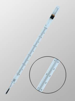 Стеклянный термометр с вложенной шкальной пластиной из листового стекла молочного цвета.